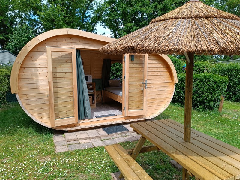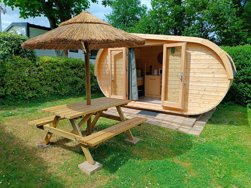 Equipement extérieur : salon de jardin en bois avec parasol paillotte + robinet extérieur à côté de la cabane, sanitaires commun du camping à 100 m parking : voiture sur emplacement ou abris vélo dans le camping.