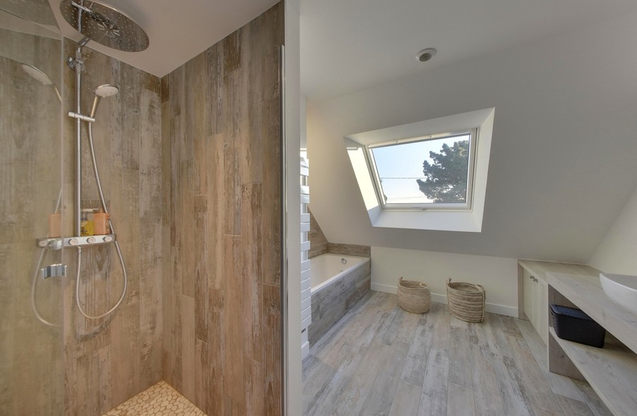 Un grand séjour avec vue sur la mer, 5 chambres, 2 salles de bain, 3 WC. Les pins centenaires encadrent le jardin de 1600 m² qui permet aux petits et aux grands de bénéficier d'espaces généreux indépendants.